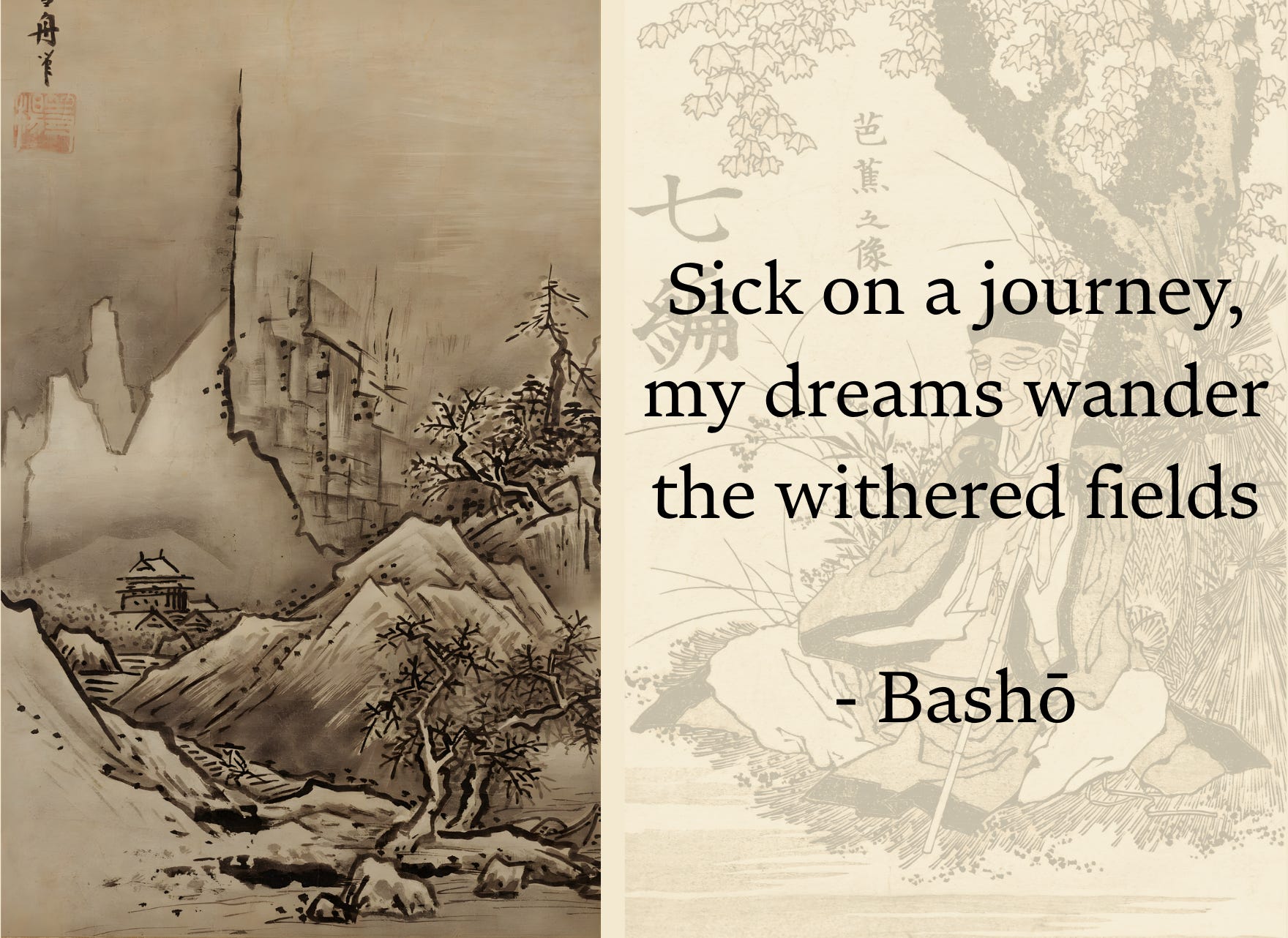 Left: excerpt from Sesshū’s ‘Winter Landscape’. Right: Bashō’s death poem
