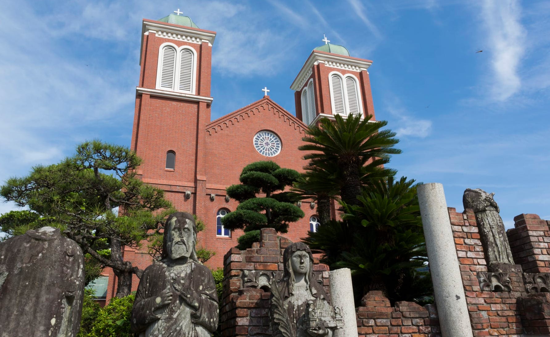 The restored Urakami Cathedral includes the bell and some of the statues from the original cathedral. Some of the statues lost their heads in the blast.
