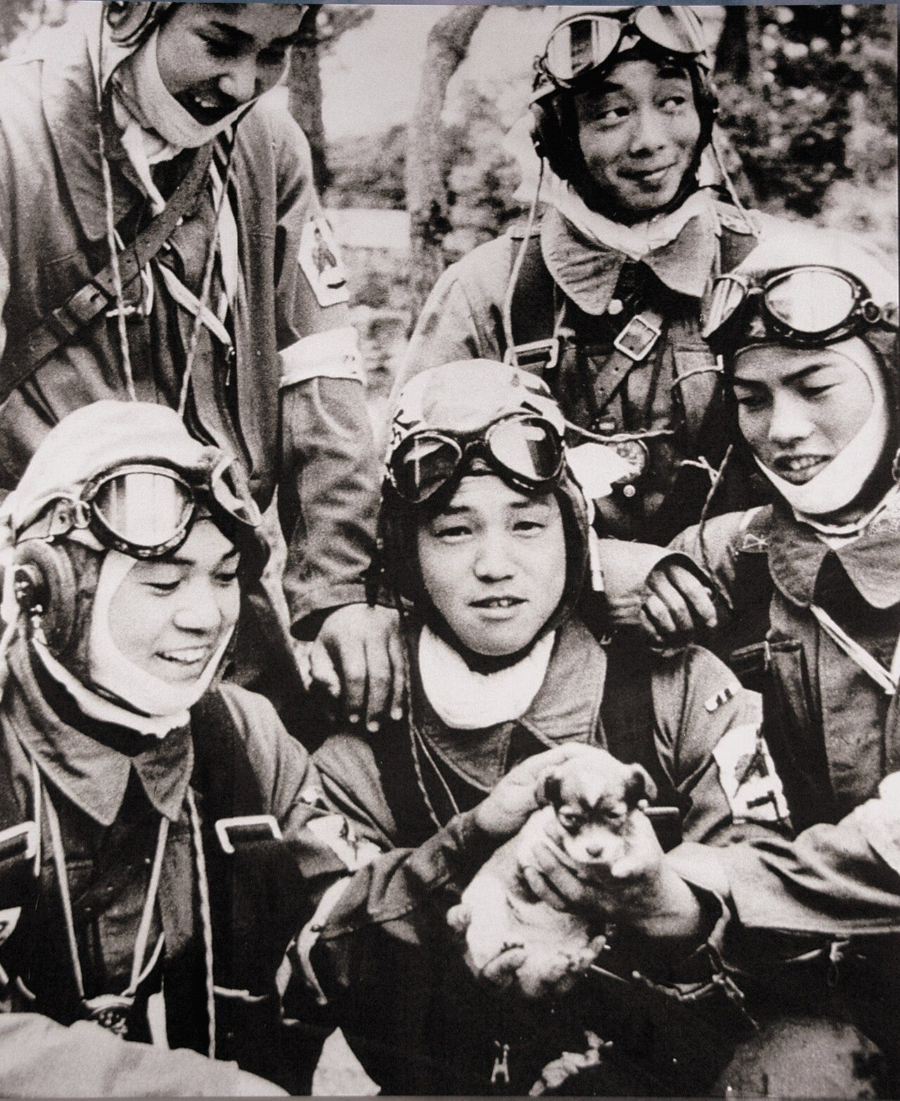 Five kamikaze pilots, pictured in May 1945. The boy holding the puppy was 17. He died the next day in a kamikaze attack.