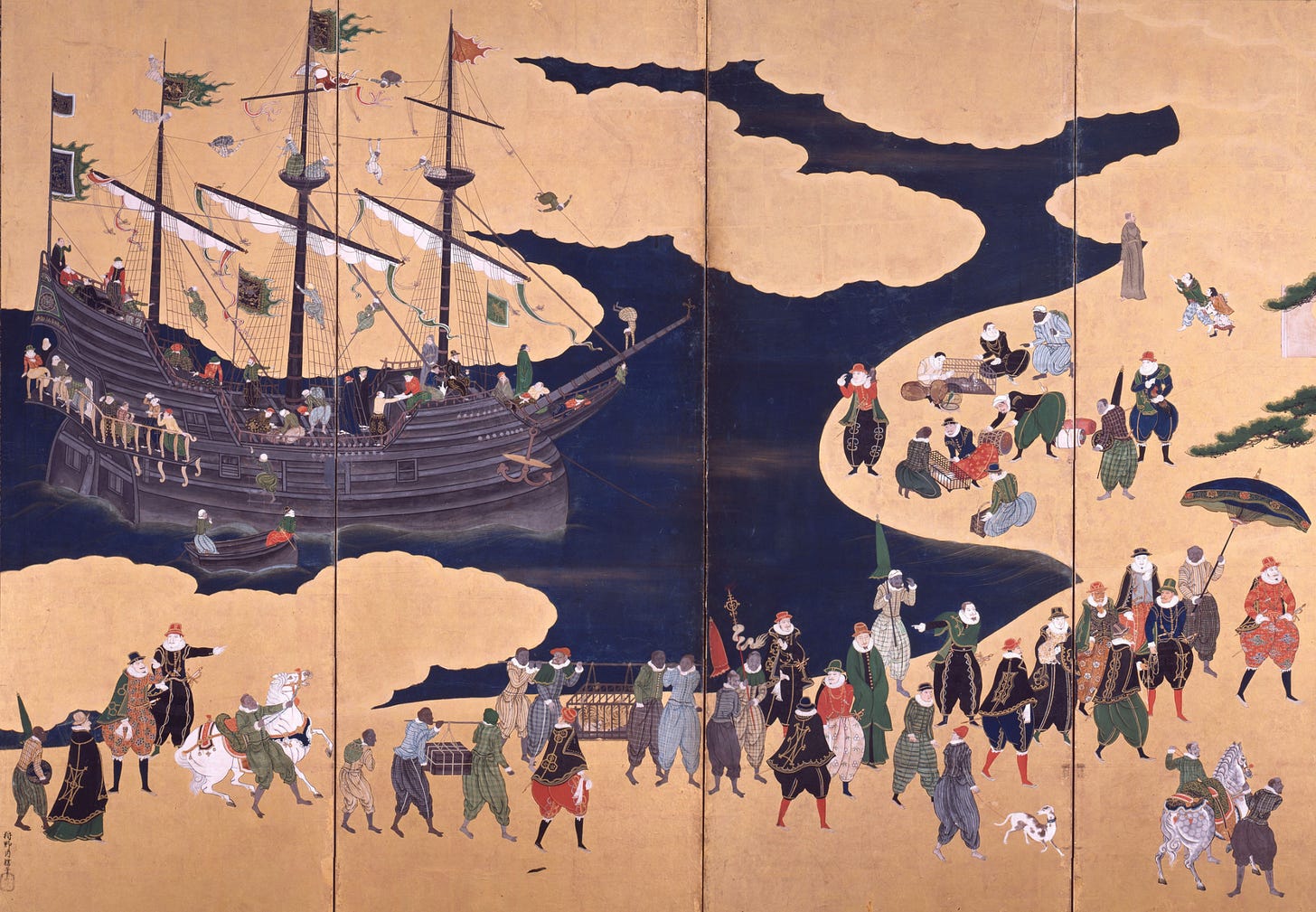 Detail from a screen painting of a Portuguese ship arriving in Japan