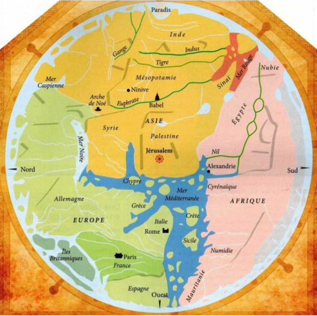 Above: a simplified (French) version of a ‘Mappa Mundi’ held in Hereford Cathedral. The map is oriented to show Paradise at the top, located to the far east of the world. Jerusalem is at the centre.