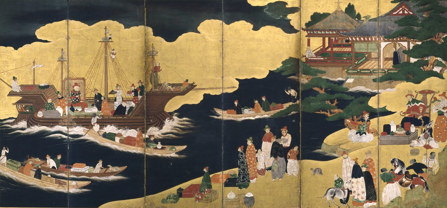 A Japanese folding screen, c. 1620 – 40, showing Portuguese merchants arriving in the port town of Nagasaki