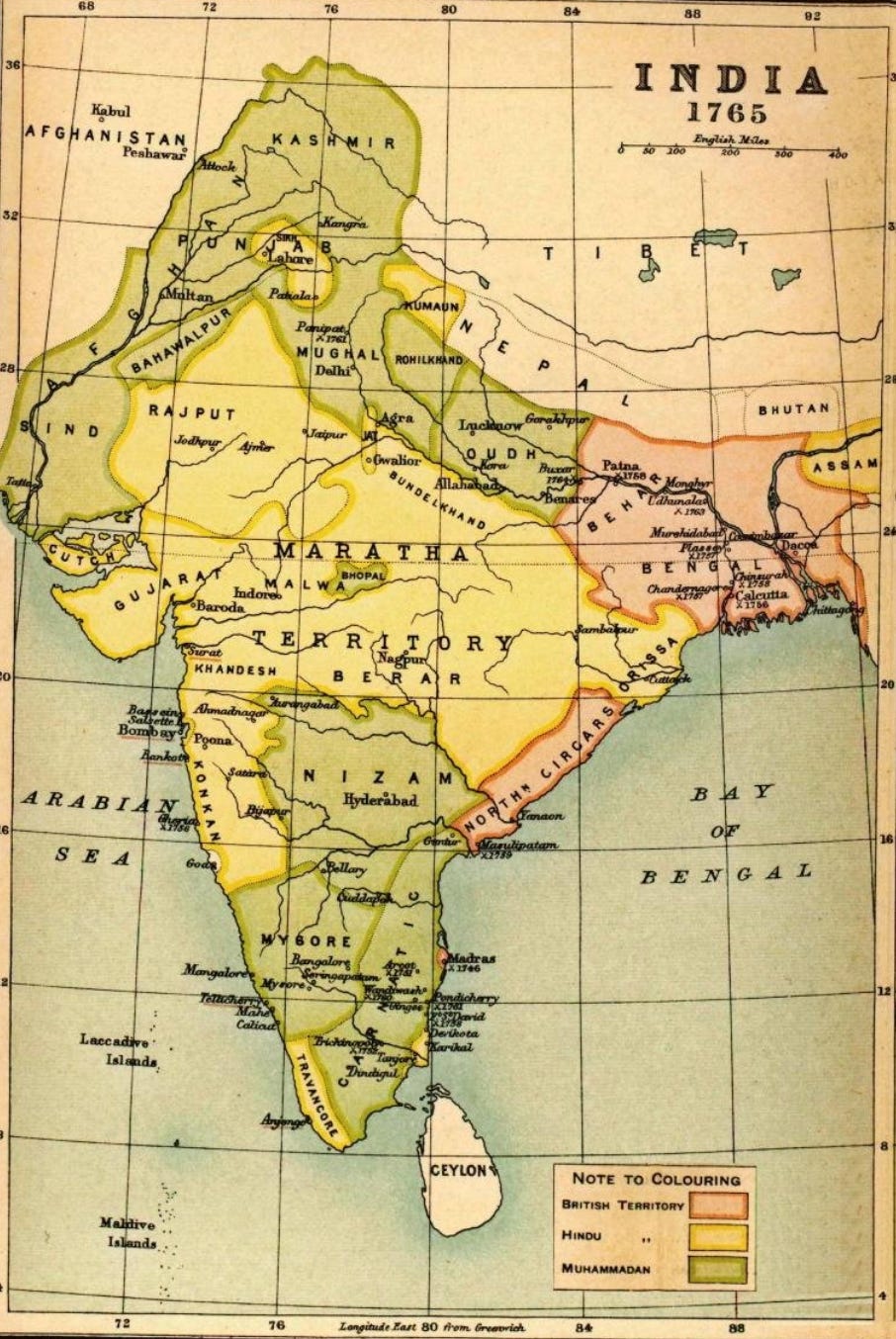 Below: map of India in 1765, showing newly-won British possessions in the east.