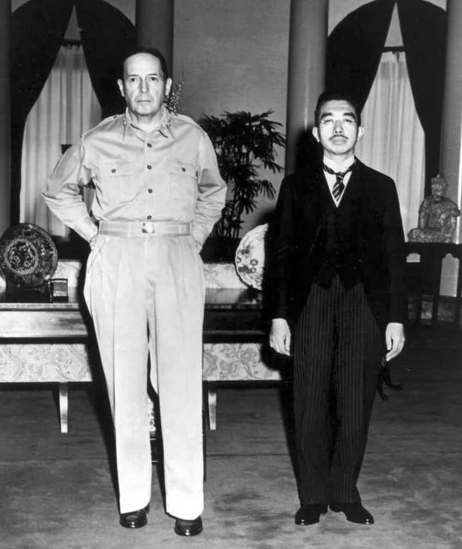 Douglas MacArthur - nicknamed the ‘Blue-Eyed Shogun’ - looms over Emperor Hirohito in a photo taken in September 1945. So vividly did the image symbolise the weakness of Japan after the war that Japanese politicians tried - and failed - to prevent its publication.